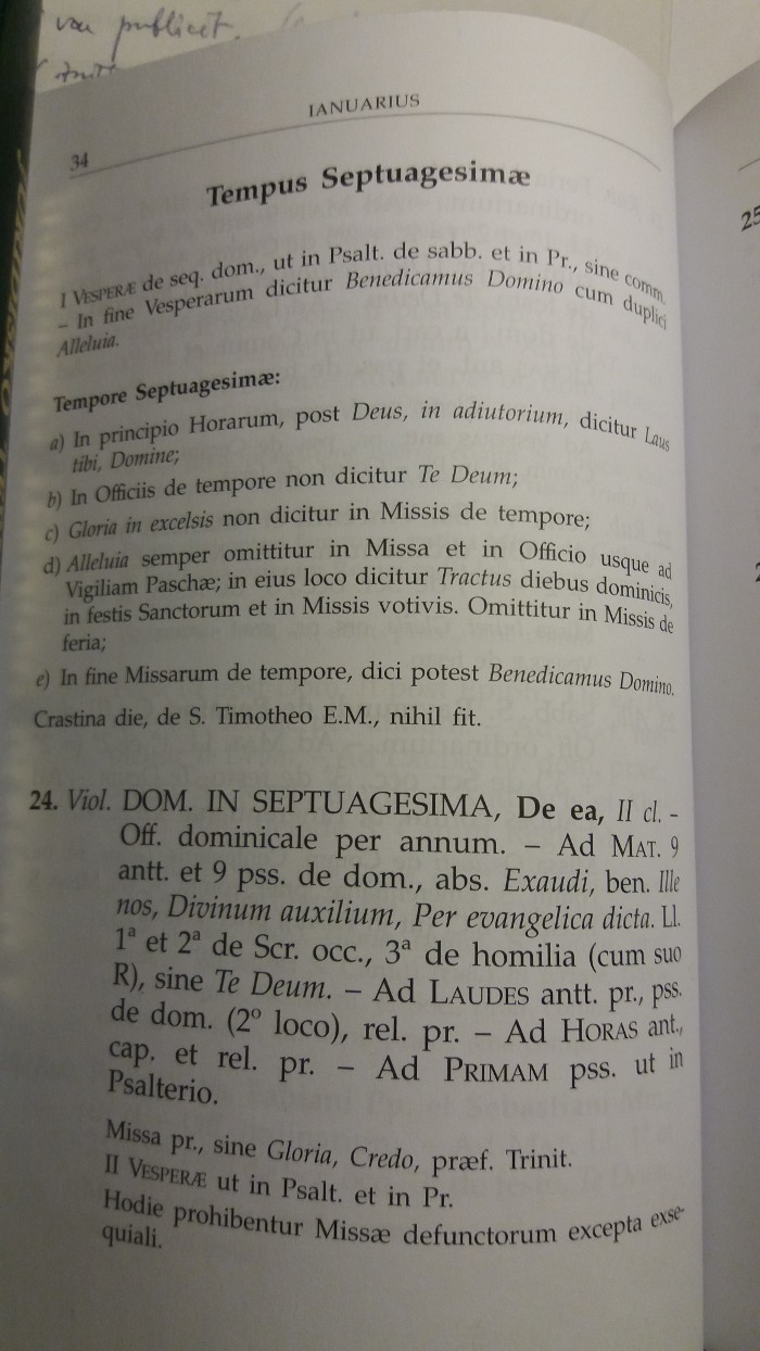 Šīs trīs svētdienas pirms Lielā Gavēņa ir viena no pamanāmākajām atšķirībām starp tradicionālo Romas rita kalendāru un 1969. gadā reformēto. Kā redzam no instrukcijām 24. janvārim 2016. gada liturģiskajā kalendārā (att.), sakristānim jāvelk no skapjiem ārā violetie paramenti, Sv. Misē nedzied Gloria, Alleluja dziedājuma vietā nāk trakts (garāks dziedājums no vairākiem psalma pantiem), Matutīnā nav Te Deum, bet visu Kanonisko stundu sākumā pēc Deus in adjutorium … nav vis Alleluja, bet gan Laus tibi Domine, Rex aeternae gloriae (Slava Tev, Kungs, mūžīgās godības karali). Lai uzsvērtu šo pāreju, 1. Vesperēs (tātad jau sestdienas vakarā) nobeiguma pantiņam Benedicamus Domino (Teiksim Kungu) un atbildei Deo gratias (Pateicība Dievam) tiek piekabināts pa dubultam Alleluja gluži kā Lieldienu nedēļā. Viduslaikos dažās katedrālēs šis brīdis pat bija saistīts ar īpašām paraliturģiskām ceremonijām ar nosaukumu “Allelūja bēres”, jo šim prieka saucienam nu bija “jāguļ kapā” līdz pat Lieldienu vigilijai.