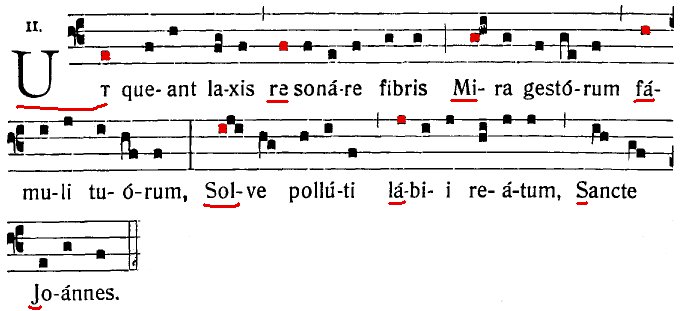 Vēlāk pirmo zilbi ut aizstāja ar labskanīgāko do. Septītās nots apzīmējuma sākotnēji laikam nebija, jo tā atradās skaņurindas “nestabilajā vietā”. Zilbe si iespējams veidota no Sancte Ioannes pirmajiem burtiem, taču attiecīgās nots himnā nav. Himnu noklausīties var, piemēram, šajā ierakstā. Ar šo dziesmu novēlu visiem vietnes lasītājiem priecīgus Jāņus un jauku vasaru.
