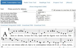 GABC Transcription Tool ir redaktors dažādu dziedājumu rediģēšanai GABC kodējumā. Ekrāns sastāv no trim logiem, no kuriem vienā var ievadīt tekstu ar akcentiem, otrā – nošu augstuma un ritmisko figūru vērtības GABC kodējumā. Vienu rediģējot, izmaiņas atspoguļojas otrā. Iespējams pārslēgties uz kopīgu logu, kas satur pilnu GABC programmas tekstu (Show integrated GABC). Šī pēdējā rediģēšanas iespēja pieejama arī moduļos Propers Tool un Psalm Tone Tool. Visos gadījumos, rediģēšanas rezultāti atspoguļojas trešajā logā, kur redzams iekodētais dziedājums nošu formā.
