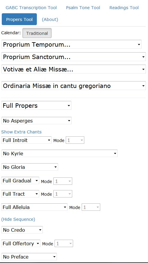 Droši vien visvairāk izmantotais no 4 moduļiem būs Sv. Mises dziedājumu redaktors Propers Tool. Nosaukums norāda uz Sv. Mises mainīgajām daļām (angl. propers, no lat. proprium), kas var būt atšķirīgas katrai Baznīcas kalendāra dienai (introits, graduāls, allelūja, trakts, ofertorijs, komūnija). Patiesībā šis rīks ietver arī korim/tautai domātās nemainīgās daļas (Kyrie, Gloria, Credo, Sanctus, Agnus Dei), kā arī speciālus Sv. Mises kārtības dziedājumus (Asperges svētdienas galvenās Mises sākumam, Ite Missa est Mises nobeigumam). Ar “izritināmu” izvēļņu palīdzību iespējams vizualizēt visus dziedājumus tādā kārtībā, kādā tie tiek izpildīti Sv. Misē, kā arī noslēpt tos, ko konkrētajā reizē nevēlas dziedāt, piem., ja tā vietā plānots dziedāt daudzbalsīgu versiju. Sasaistē ar mobilā telefona kalendāra funkciju, atverot lietotni, lietotājam tiek piedāvāts attiecīgās dienas datuma dievkalpojums, taču ir iespējams ritināt izvēlni, līdz atrod citu vajadzīgo datumu. Piedāvāti tiek dievkalpojumi gan no Lieldienām un Ziemassvētkiem piesaistītā svētdienu kalendāra (Proprium temporum), gan datumiem piesaistītā svēto piemiņas dienu kalendāra (Proprium sanctorum). Ir vēl iespējas izvēlēties dažādas īpašas Mises (piem., par mirušajiem), kā arī izmantot funkciju “sastādi pats”, kur var izvēlēties mainīgās daļas pēc to tekstu iesākuma vārdiem. Gala rezultātā lietotājs iegūst visus izvēlētos dziedājumus vienā garā nošu lapā, ko tad var ar pirkstu bīdīt uz priekšu un dziedāt. Iespējama izvēle arī starp tradicionālo “Tridentes” vai arī reformēto (“Novus ordo”) Romas rita formu. Tāpat kā Square Note, arī šeit iespējams melodijas atskaņojums ar transpozīciju.