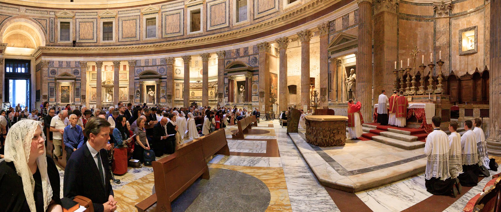 Pēc Krusta ceļa ticīgie devās uz Panteonu – ēku, kuru Senās Romas laikos cēla kā visu dievu templi, bet kura viduslaikos kļuva par baznīcu Sancta Maria ad Martyres, kur notika svinīga Sv. Mise, kurā kalpoja premonstriešu kanoniķi no Gödöllő abatijas Ungārijā (celebrants – pr. Ervins Kovāčs, kuram arī zināmi nopelni tradicionālās Mises atjaunošanā Lietuvā). Šie kanoniķi nodrošina arī regulāru tradicionālo Misi Budapeštas Sv. Miķeļa baznīcā, no kurienes bija ieradies arī koris, kurš dziedāja šajā dievkalpojumā. Dievkalpojuma dalībnieku vidū bija arī Ungārijas vēstnieks pie Sv. Krēsla un Suverēnā Maltas militārā ordeņa Eduards Habsburgs. Jāatzīmē, ka šajā dienā svētceļniekiem nācās saskarties ar “šķiru cīņu”, jo vairākas Itālijas transporta darbinieku arodbiedrības bija izsludinājušas streiku, kas daļēji paralizēja gan pilsētas, gan starppilsētu satiksmi (autobusus, tramvajus, vilcienus).