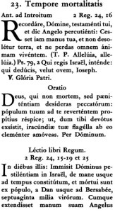 Tā, piemēram, minētās Sv. Mises introitā citēts Bībeles stāsts par nāvīgu sērgu, ar kādu Dievs savās dusmās piemeklēja savu tautu; šis teksts arī pirmajā lasījumā (2 Ķēn. (2. Sam.) 24:15–19,25):