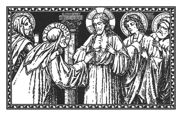 Bet šīs dienas evaņģēlija lasījums ir stāsts par neticīgo Tomu (Jņ. 20:19–31), kurš nedēļu pēc Kunga augšāmcelšanās varēja viņu kopā ar citiem mācekļiem satikt miesā un aptaustīt Viņa brūces. Pāvests Gregors Lielais to komentē sekojoši: