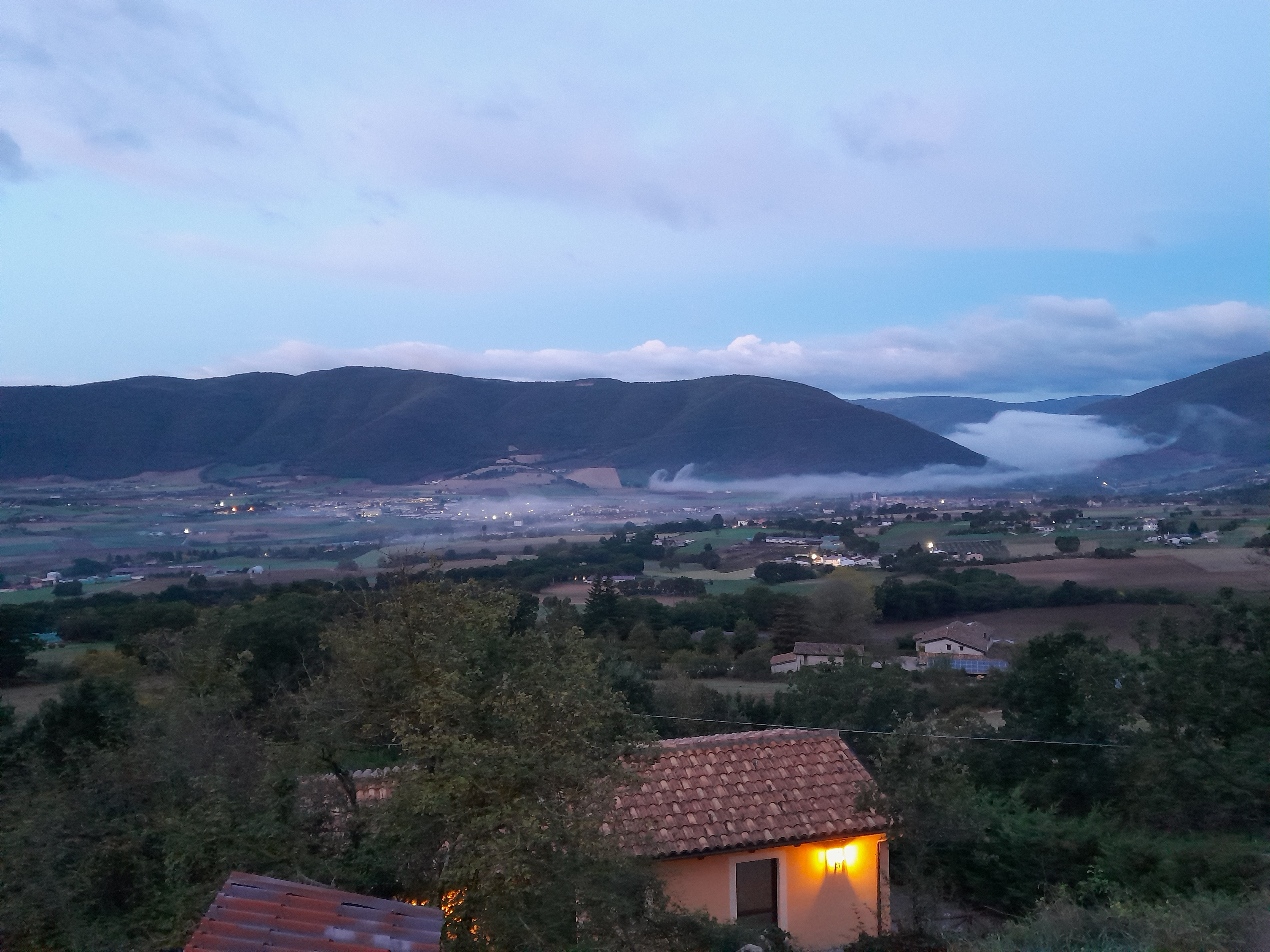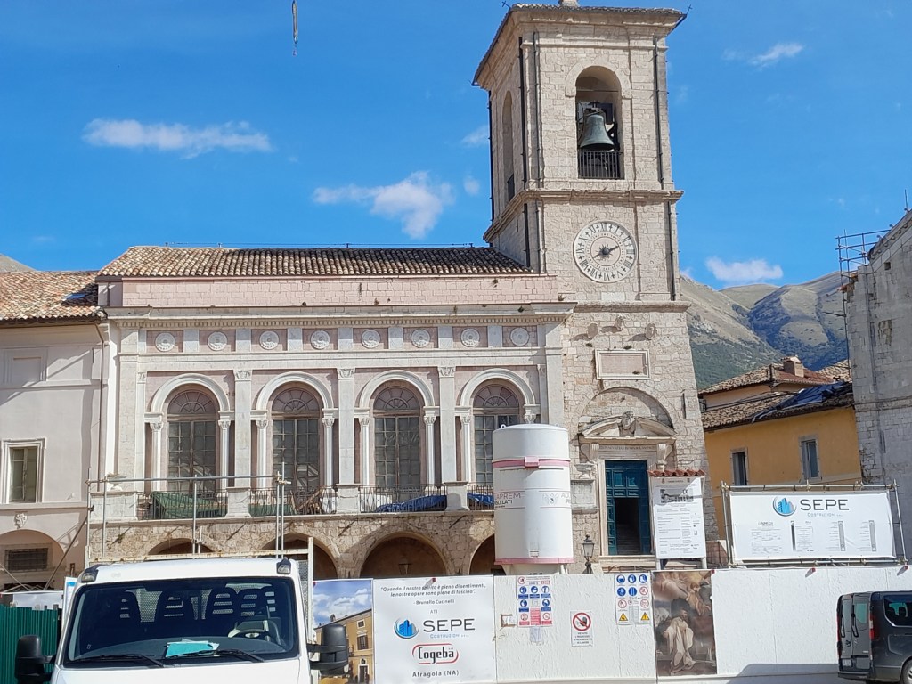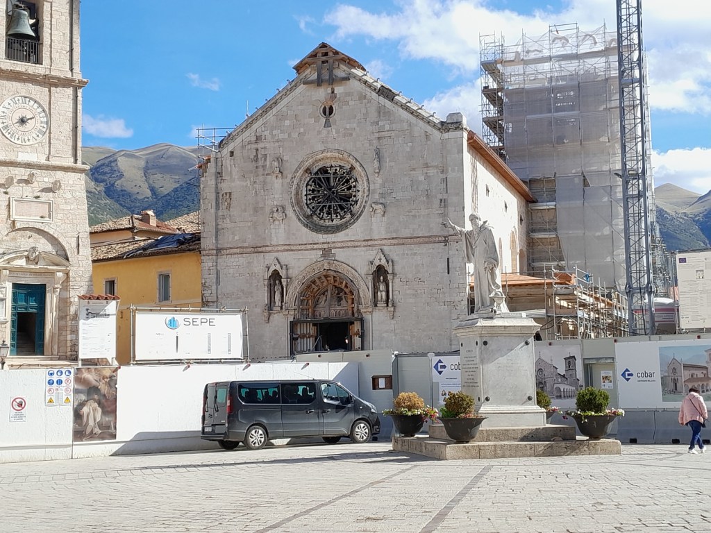 Tas, ka klosteris patiesi atrodas augstu kalnā ar skatu uz Norčas pilsētu, ir dabas katastrofas sekas. Līdz 2016. gada vasarai mūki dzīvoja pilsētas centrā pie Sv. Benedikta bazilikas un arī dievkalpojumus noturēja šajā dievnamā. Izveidojās laba sadarbība gan ar diecēzi, gan ar pilsētas varas iestādēm. Taču minētā gada rudenī zemestrīce pamatīgi izpostīja daudzas pilsētas Umbrijā. Stipri cieta arī Norčas vēsturiskais centrs, lielā mērā sagrauta arī bazilika un klostera telpas; par laimi cilvēku upuru nebija. (Par Norčas pilsētu un mūku dzīvi tajā īsi pirms zemestrīces var izlasīt Džūliāna Kvasņevska bagātīgi ilustrētā reportāžā.)