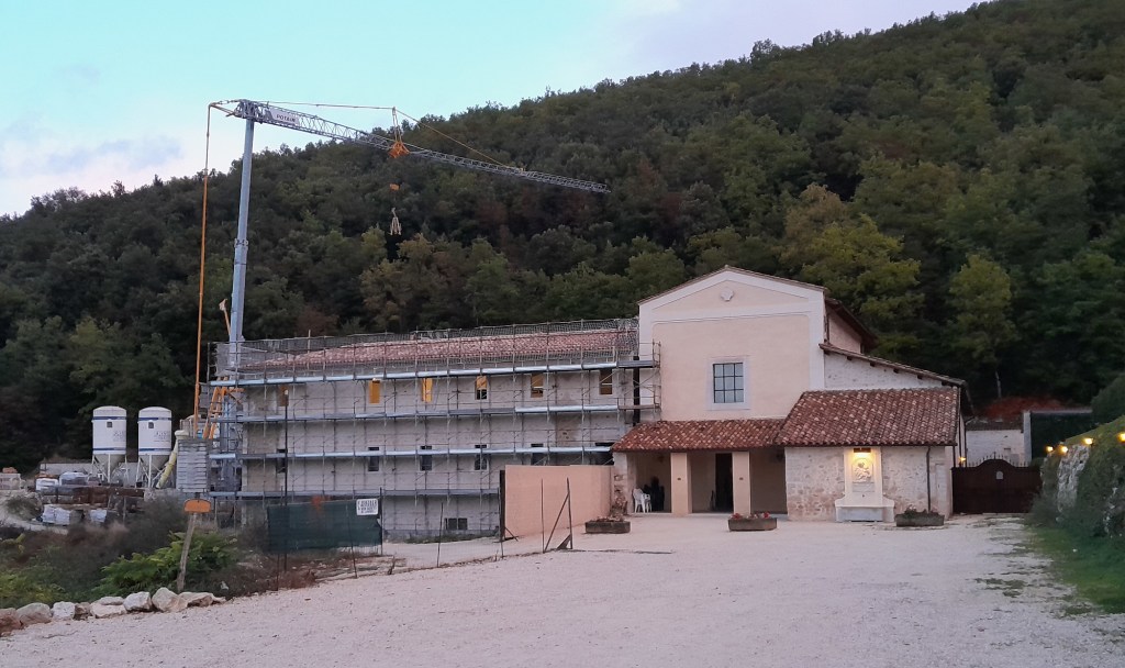 Tā nu mūki, apmetušies pagaidu dēļu barakās un saliekamajās mājiņās, jaunajā īpašumā uzsāka vairākus gadus ilgu dzīvi būvlaukuma apstākļos, vispirms izremontējot Žēlsirdības Dievmātei veltīto kapelu, kurā ir sagalabāti daži sakrālās mākslas darbi no iepriekšējo lietotāju kapucīniešu laikiem. Citi dievnama iekārtojuma elementi gan iegādāti no vietām, kur tie kļuvuši nevajadzīgi, gan – kas īpaši svarīgi – pasūtināti no jauna, tādējādi dodot iespēju seno amatu mūsdienu meistariem un māksliniekiem saglabāt un attīstīt savas prasmes. Gan veco ēku atjaunošana, gan jauno celšana noris Itālijas būvuzraudzības un pieminekļu aizsardzības iestāžu pārraudzībā, izmantojot labākās antiseismiskās tehnoloģijas.