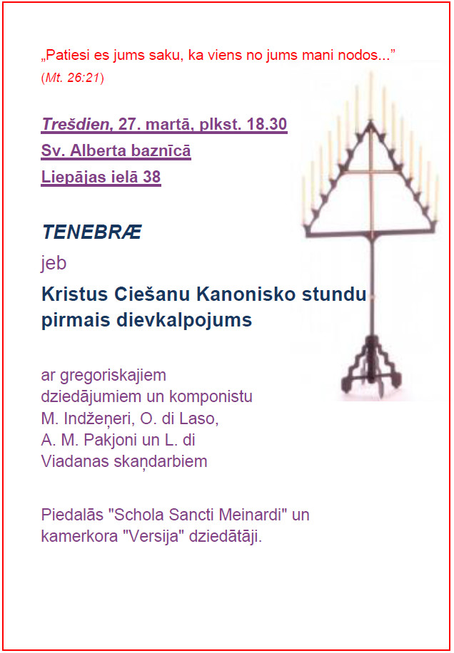 – Sv. Rakstu lasījumus: https://unavoce.lv/2018/03/26/tenebrae-dievkalpojumi/